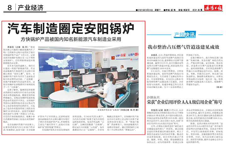 在方快鍋爐的客戶回訪簿上,記者多次看到汽車行業(yè)客戶的評語:性能穩(wěn)定,皮實(shí)可靠!在方快鍋爐的生產(chǎn)訂單排期上,記者檢索到國內(nèi)新能源汽車品牌“小鵬”汽車增訂了兩臺(tái)方快鍋爐的產(chǎn)品,在規(guī)模化工業(yè)生產(chǎn)盛行的當(dāng)下,這是對方快鍋爐及“安陽制造”的肯定。