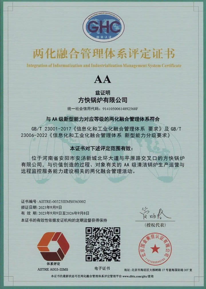 近日,方快鍋爐有限公司順利通過《信息化和工業(yè)化融合管理體系要求》(GB/T 23001-2017)和《信息化和工業(yè)化融合管理體系新型能力分級要求》(GB/T 23006-2022)認(rèn)證,并獲得兩化融合管理體系A(chǔ)A級評定證書。這無疑是對方快堅持“智”造業(yè)突破的認(rèn)可,也充分表達出方快對持續(xù)推進數(shù)字化經(jīng)營管理的決心。