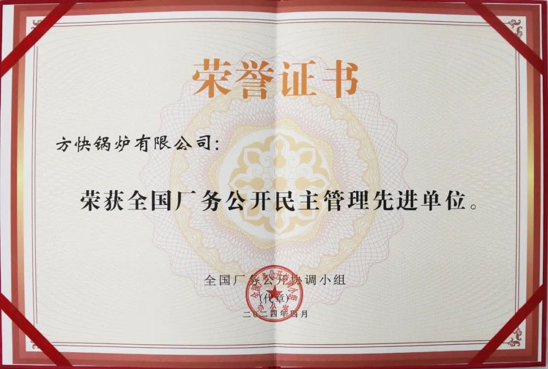 近日,全國(guó)廠務(wù)公開協(xié)調(diào)小組印發(fā)《關(guān)于表彰2021-2023年全國(guó)廠務(wù)公開民主管理工作先進(jìn)單位的決定》,方快鍋爐榮獲“2021-2023年全國(guó)廠務(wù)公開民主管理先進(jìn)單位”榮譽(yù)稱號(hào)。