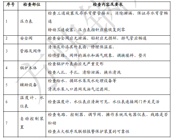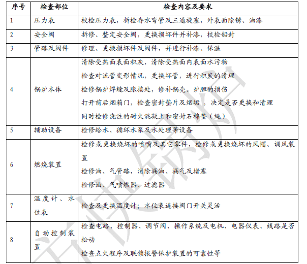 2、鍋爐運(yùn)行每一年后進(jìn)行一次二級(jí)維護(hù),二級(jí)維護(hù)是指有計(jì)劃地安排停爐,對(duì)設(shè)備進(jìn)行全面的、恢復(fù)性的檢修或更換零部件的保養(yǎng)工作,以維修人員為主,鍋爐運(yùn)行人員為輔,具體項(xiàng)目見下表: