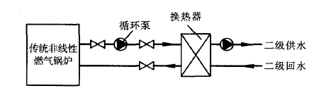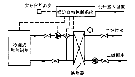 鍋爐自動控制系統(tǒng)根據(jù)設(shè)計室內(nèi)溫度及實際室外溫度計算出二級供水溫度,將計算二級供水溫度與實際二級供水溫度進行比較,由鍋爐自動控制系統(tǒng)控制鍋爐的熱功率,使得實際二級供水溫度接近計算二級供水溫度。