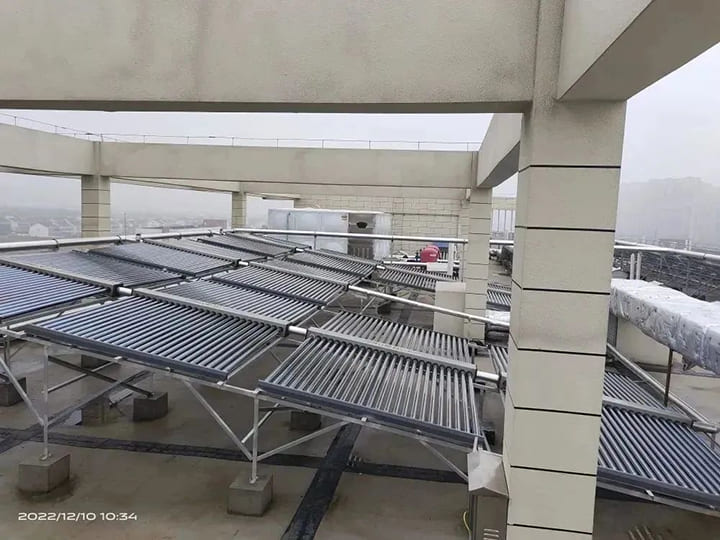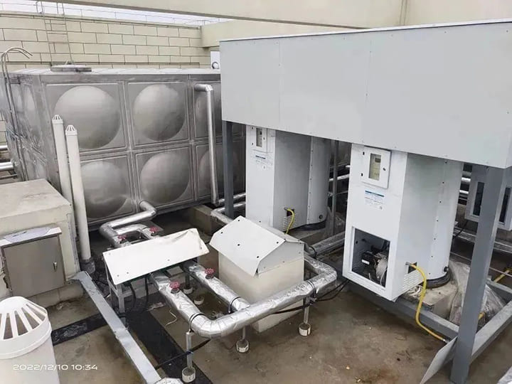 設(shè)備:11臺V3系列室外型商用容積式熱水爐(熱負荷99Kw)+太陽能集熱器