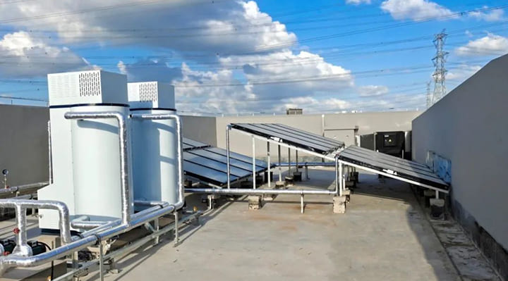 晴好天氣時,集熱器通過吸收陽光能量將水加熱,儲存在保溫水箱,確保全天熱水供應;陽光資源不足時,則自動啟動商用容積式熱水爐,制備足量的生活熱水,滿足學校師生的熱水使用需求。兩者相輔相成,在保證熱水舒適的同時,極大程度地降低了熱水成本。