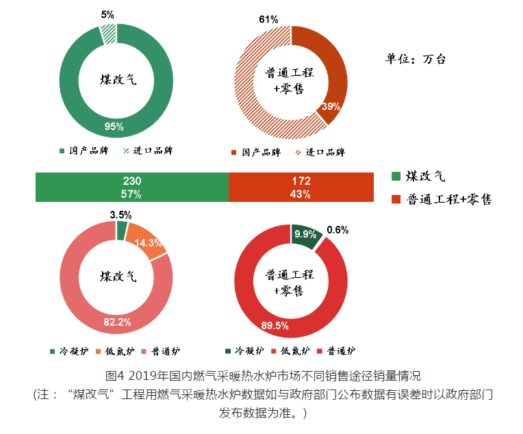 2019 年用于“煤改氣”工程的燃?xì)獠膳療崴疇t銷量為 230 萬臺(tái),占全年總銷量的 57% ,相比 2018 年(“煤改氣”工程用銷量 145 萬臺(tái))增幅 58.6% 。其中,冷凝爐銷量為 8 萬臺(tái),占“煤改氣”工程總銷量的 3.5% ;低氮爐銷量為 33 萬臺(tái),占“煤改氣”工程總銷量的 14.3% ;普通爐銷量為 189 萬臺(tái),占“煤改氣”工程總銷量的 82.2% 。國(guó)產(chǎn)品牌銷量為 219 萬臺(tái),占“煤改氣”工程總銷量的 95% ;進(jìn)口品牌銷量為 11 萬臺(tái),占“煤改氣”工程總銷量的 5% 。